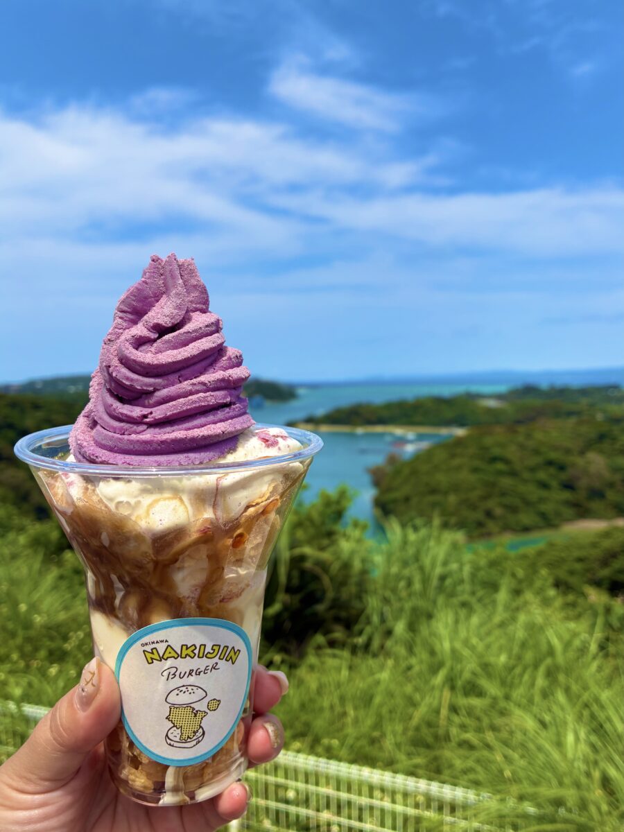 久米島産の濃厚な紅芋ペーストを独自の配合で作った紅芋ホイップがプレミアムミルクソフトと相性抜群👍✨黒蜜ときな粉で和風感たっぷりの色もきれいなサンデーです🤤