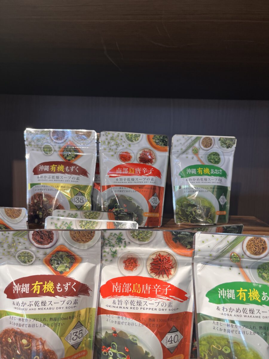 あおさとわかめスープ、島唐辛子の旨辛スープ、もずくとめかぶスープと3種類あり、どれも磯の香りを感じれる、ほっと温まるお味ですよ☺️
